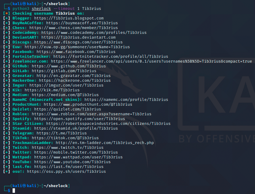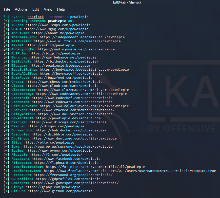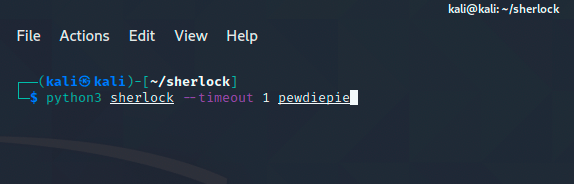 In the above image, we’re running the sherlock command with the timeout flag set at 1 second for a quick scan.